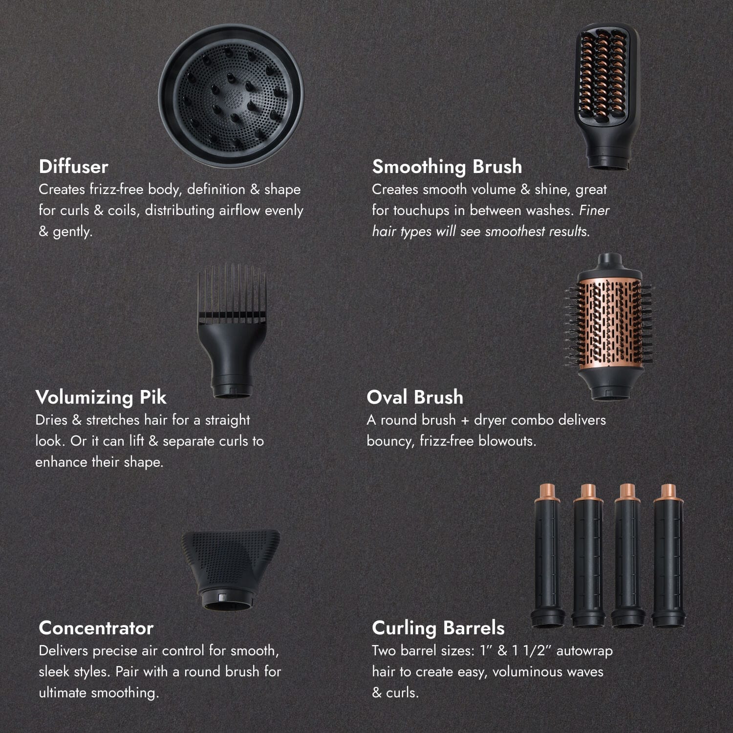 • Features nine attachments for customizable styling options